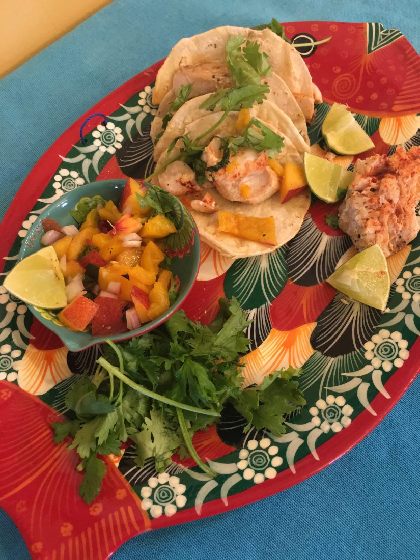 - Place 2 tortillas on each plate; top with a serving of fish and peach salsa. ¡Fácil!